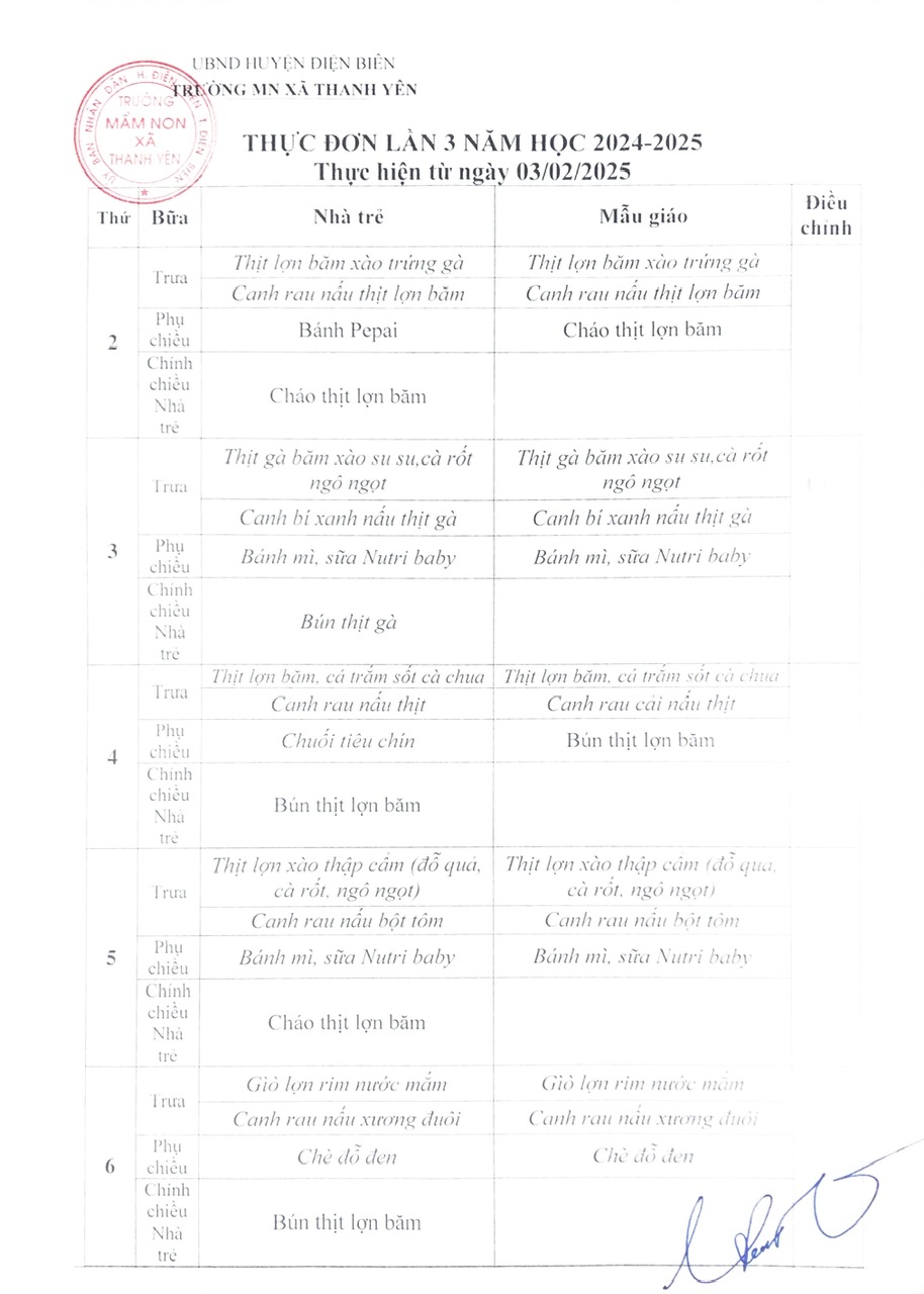 Thực đơn đợt 3 HK II